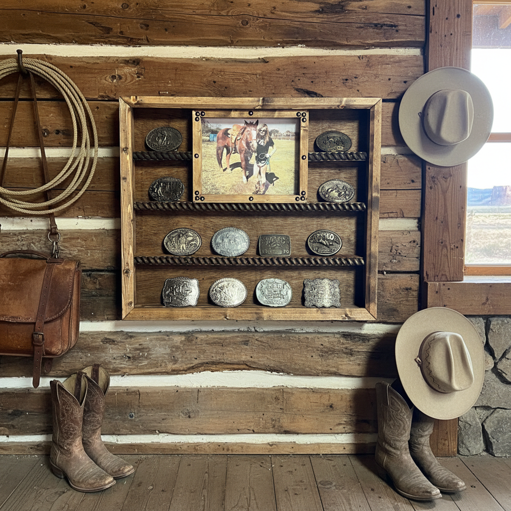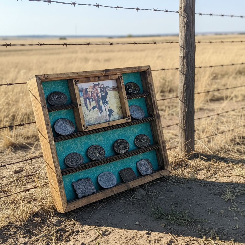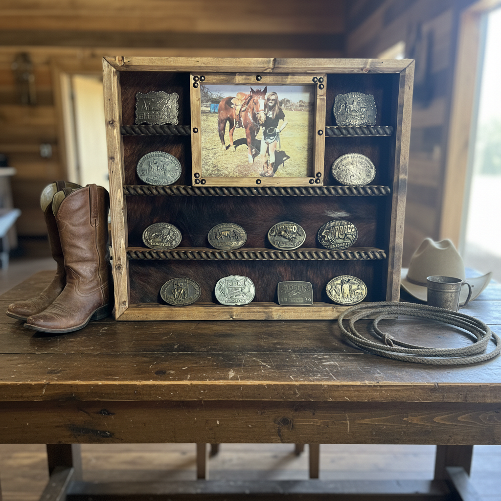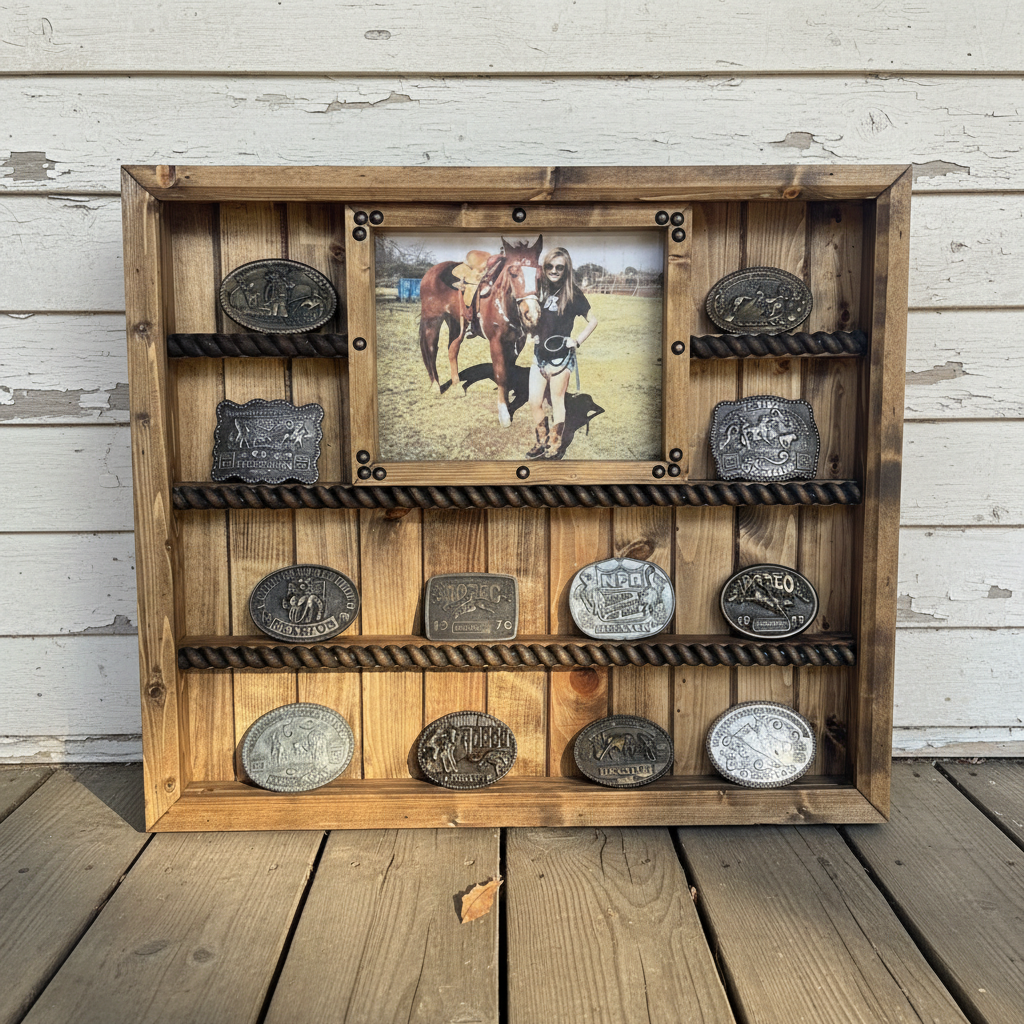 This Handcrafted Trophy Buckle Display Case holds up to 14 Buckles. It will accommodate buckles up to 5" high. Features handmade simple moldings, Wood rope shelf accents, and an 8x10 picture frame for a framed portrait of the buckle winner. Brown, Black, or Turquoise embossed faux leather, zebra, cheetah, or...