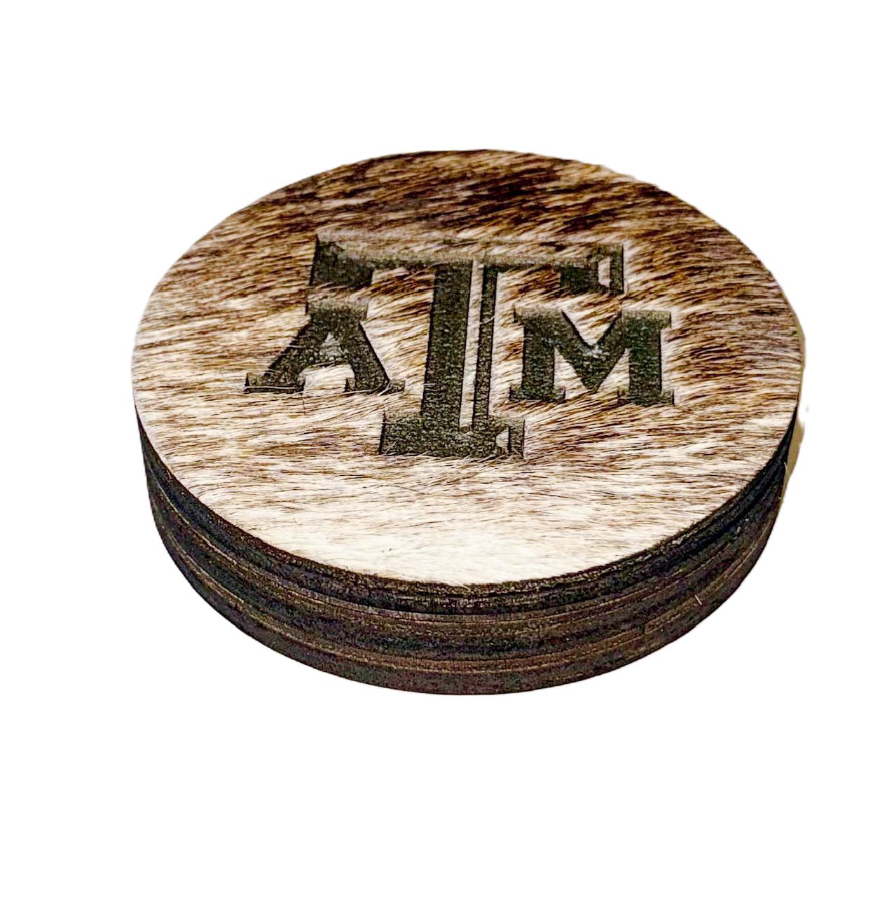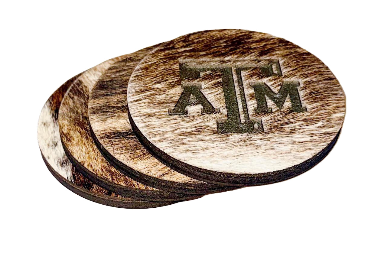 Genuine Cowhide coasters with solid wood backing. The A&M Logo is laser engraved into the cowhide for a detailed and permanent picture. Coasters measure 4" in diameter and about 5MM thick. Price is for a set of 4 and as always, shipping is free! Cowhide will vary from pictured, but...