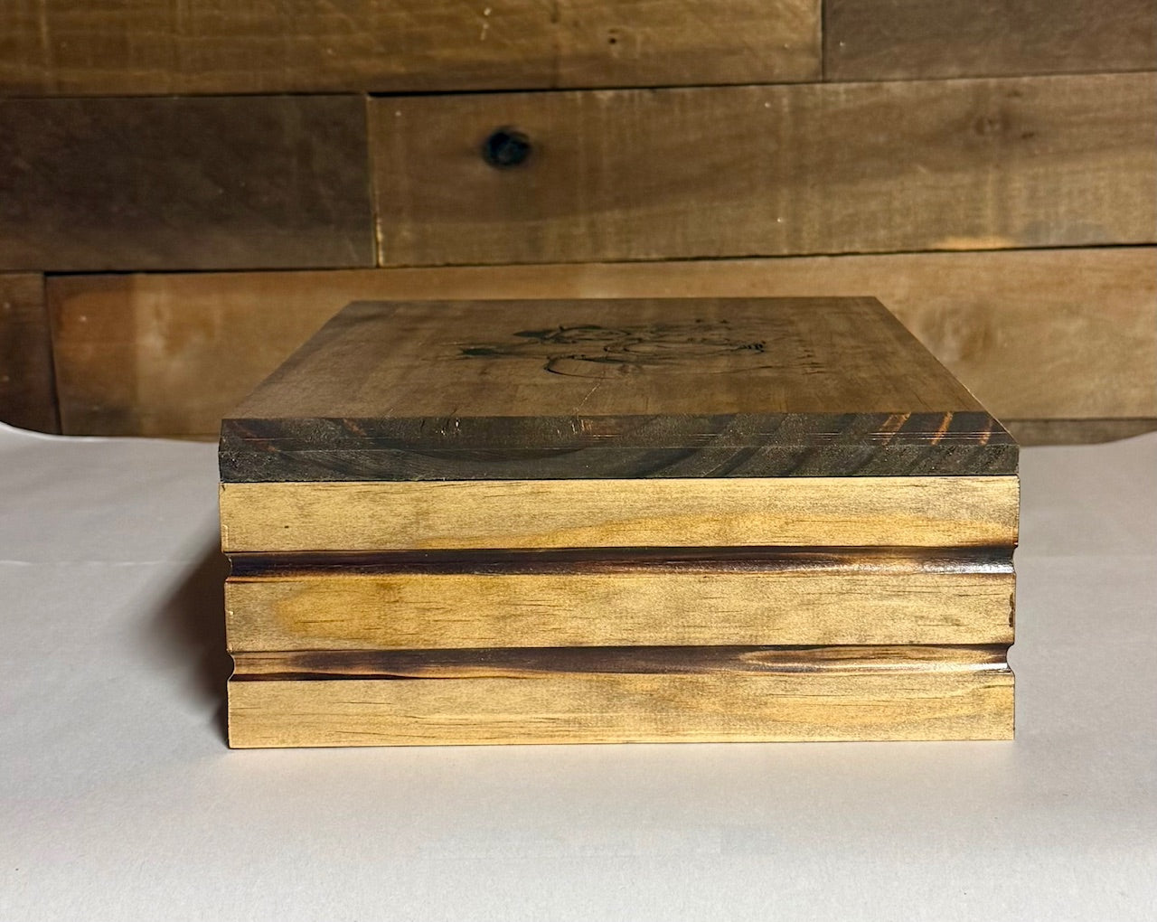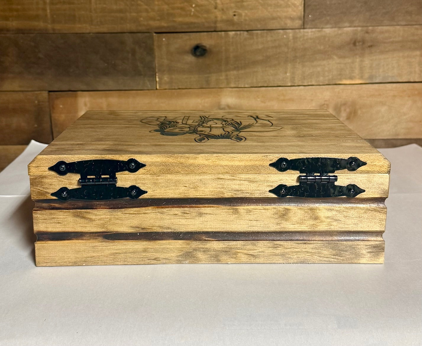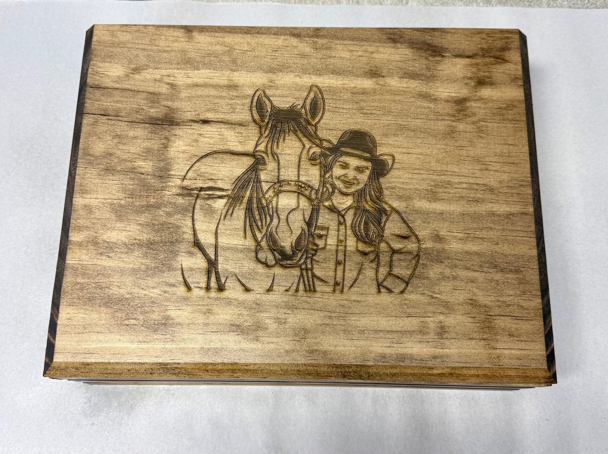 This is a beautiful yet simple engraved jewelry box. It is a select pine construction built to last a lifetime. Order one of our stock graphics or choose your own graphic or text for the top. The interior of the box is lined with a rich brown embossed faux leather....