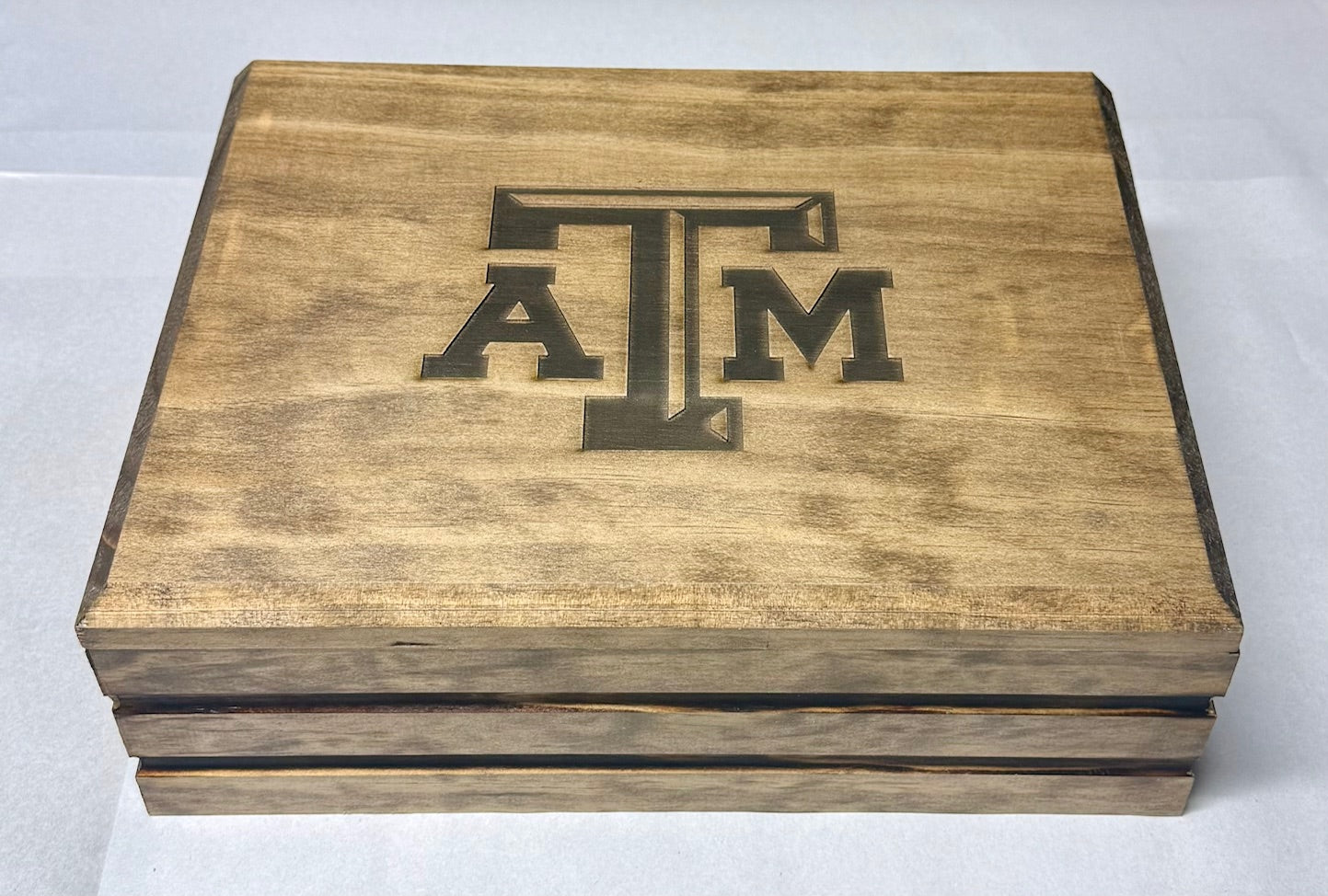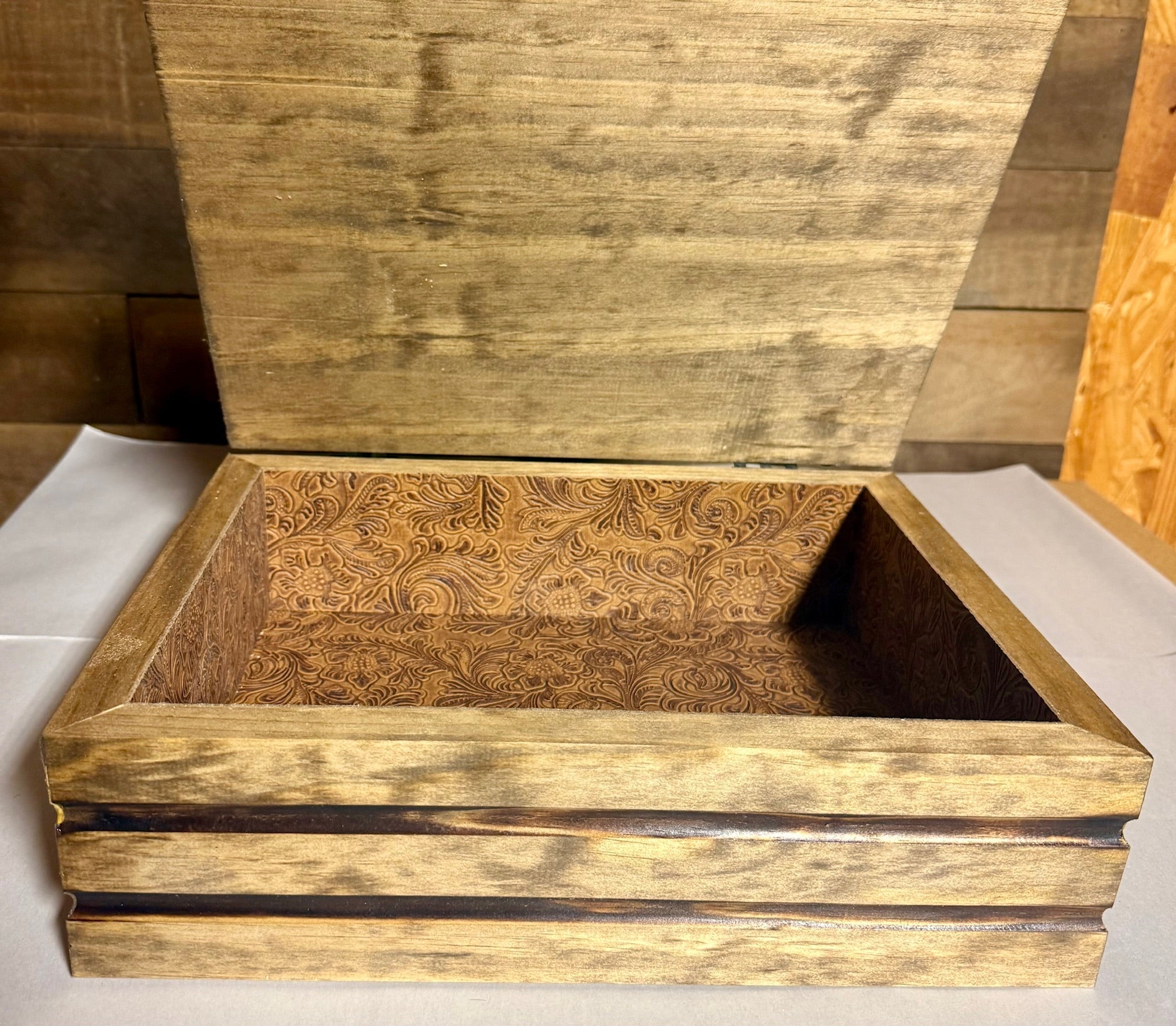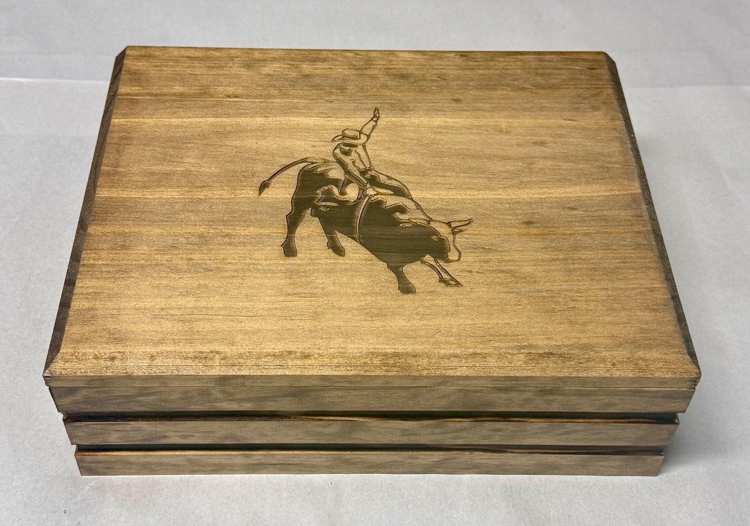 This is a beautiful yet simple engraved jewelry box. It is a select pine construction built to last a lifetime. Order one of our stock graphics or choose your own graphic or text for the top. The interior of the box is lined with a rich brown embossed faux leather....